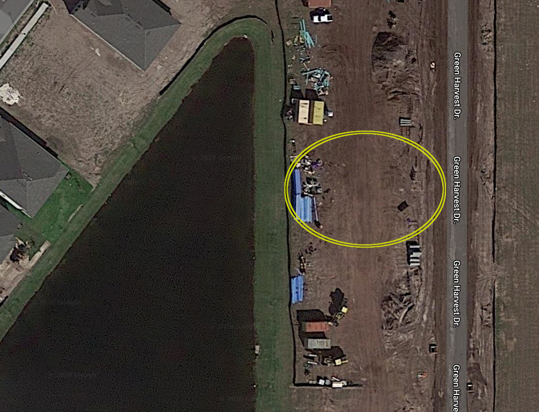 It backs up to a pond (see below).  That yellow circle is where our new house is going to be built.